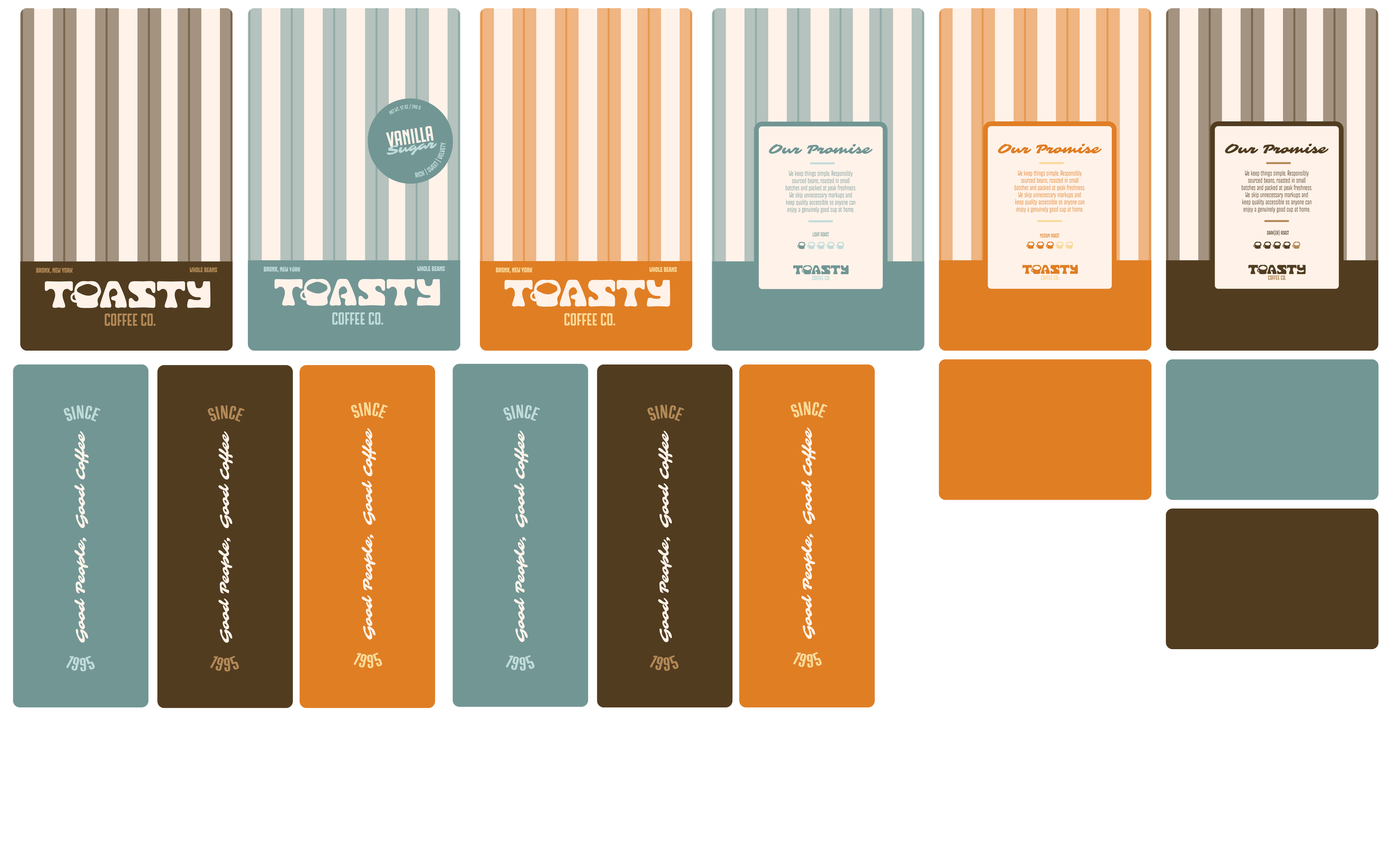 Building the Toasty identity required a deep dive into 'New Retro' design. I focused on iterative prototyping, specifically experimenting with the tension between busy, nostalgic patterns and clean, minimalist layouts. By refining these elements side-by-side, I was able to create a consistent brand language that captures a vintage 'bottomless cup' spirit through a contemporary lens.